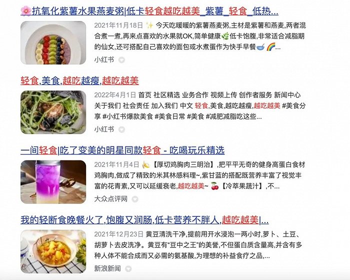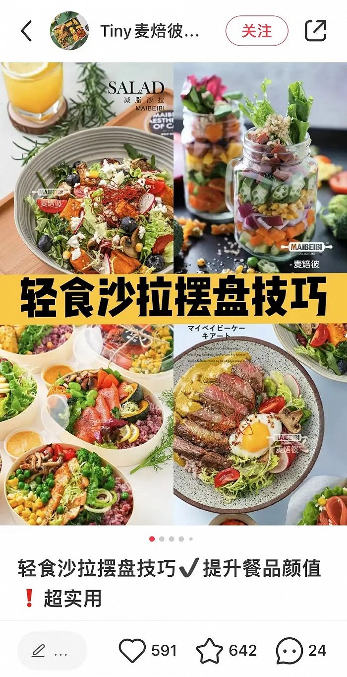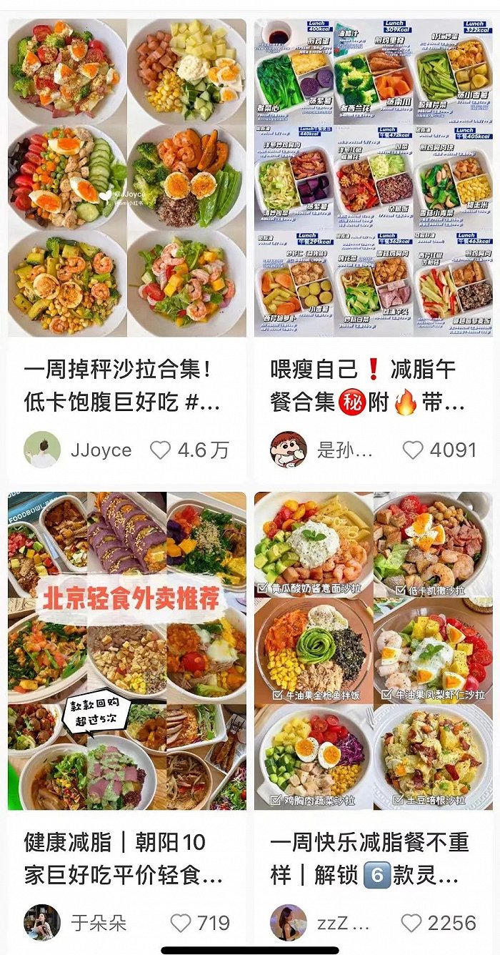 从形成认同,到消费行为的不断转化,轻食之风越刮越盛,社交媒体平台功不可没。在各种平台上,伴随着各种减脂操走红,轻食也迎来了一波一波的热度。明星、网红、健身博主们都在不遗余力地分享“瘦身食谱”。从“10天轻断食减肥食谱,掉称快不反弹不暴食”到“健身私教定制给我的减肥期健身详细食谱”,标题令人疯狂心动,而点进去无不是如何制作轻食。