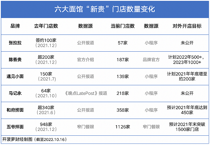 开菠萝财经结合品牌官方微信小程序、大众点评、第三方查询平台,得出一组数据,张拉拉、陈香贵、遇见小面、马记永、和府捞面和五爷拌面,当前的全国门店数分别是57家、187家、139家、218家、358家、1126家。